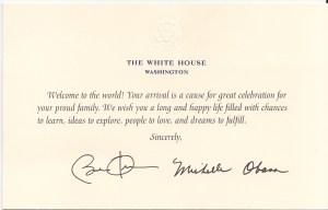 If you know someone who is expecting or has recently given birth, tell them to send a birth announcement to the White House (1600 Pennsylvania Avenue, Washington DC, 20500), and then be patient. It took about 3 months, but what a great addition for the baby book!